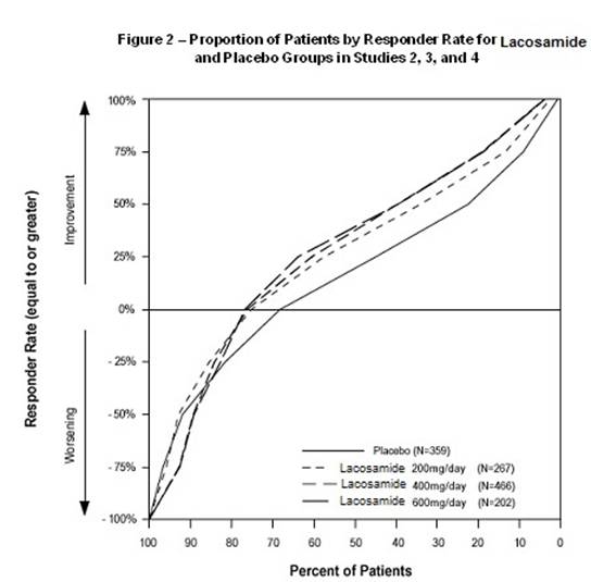 The text provides information on responder rate for Lacosamide and placebo groups in different studies. It includes data on the proportion of patients by responder rate for different dosages of Lacosamide. Study participants took Lacosamide at various daily doses and the text appears to be showing the percentage of patients in different groups.*