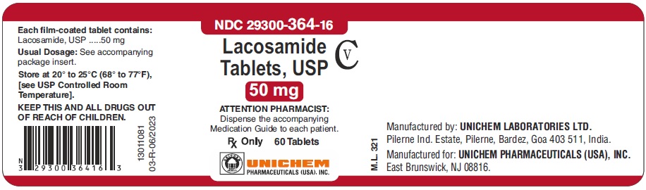 This text provides information about a medication called Lacosamide in 50 mg film-coated tablets. It includes details on dosage, storage instructions, and a reminder to keep the drug out of reach of children. The manufacturer is Unichem Laboratories Ltd., located in Goa, India, and it is manufactured for Unichem Pharmaceuticals (USA), Inc. The NDC number is 29300-364-16. Additionally, there is a note for pharmacists to dispense the Medication Guide to each patient.*