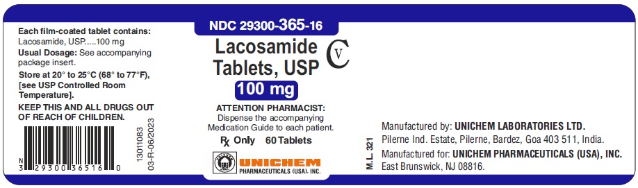 This text provides information about Lacosamide tablets containing 100 mg of the active ingredient. The usual dosage instructions are not available in the given text, but it recommends storing the tablets at a temperature range of 20°C to 25°C. The medication should be kept out of reach of children. It includes a product code and a National Drug Code (NDC). The manufacturer is Unichem Laboratories Ltd. in Goa, India, and these tablets are made for Unichem Pharmaceuticals (USA), Inc. Pharmacists are advised to dispense the accompanying Medication Guide to each patient. There are 60 tablets in the package.*