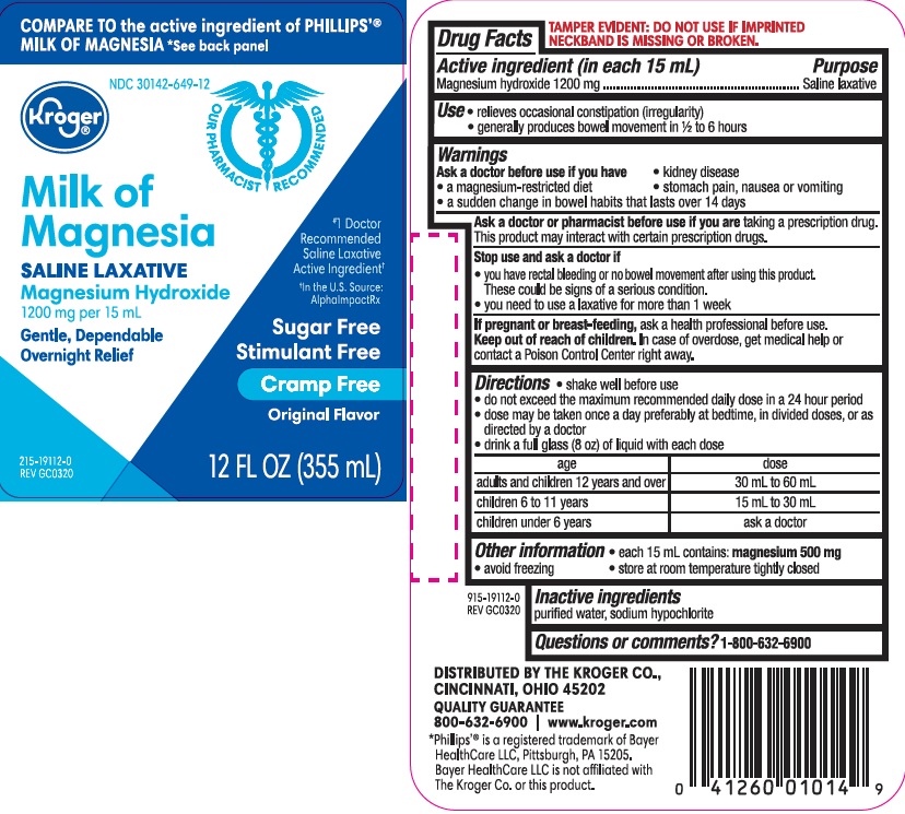 The following image provide visual information about the product associated with Milk Of Magnesia NDC 30142-649 by Kroger Company, such as packaging, labeling, and the appearance of the drug itself. This resource could be helpful for medical professionals, pharmacists, and patients seeking to verify medication information and ensure they have the correct product.
