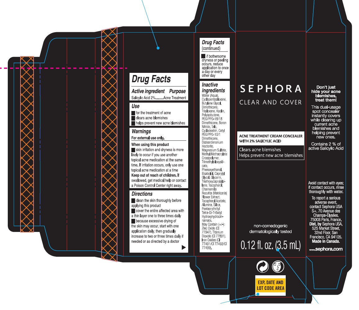 This is a drug facts label for an acne treatment cream concealer with 2% salicylic acid. It helps to clear acne blemishes and prevent new ones. It should only be used externally and may cause skin irritation and dryness. Excessive use may result in excessive drying of the skin. Users must be careful if they use other topical acne medications at the same time. If skin irritation occurs, only one topical acne medication should be used at a time. It is also advised to keep the product out of reach of children. The inactive ingredients include various chemical compounds. The concealer is non-comedogenic and dermatologically tested. It is manufactured in Canada and distributed by Sephora USA.*
