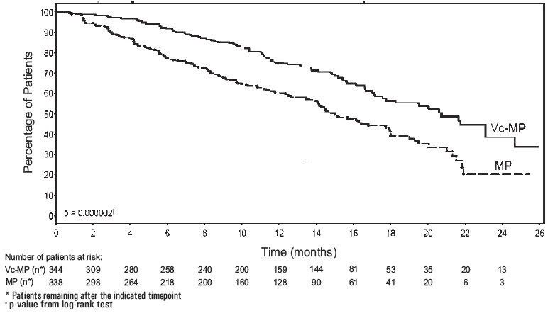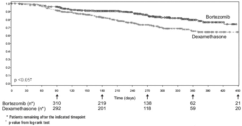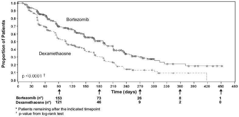 This is a statistical analysis comparing the effectiveness of Bortezomib and Dexamethasone treatment over time. The data includes the number of patients remaining at different timepoints after receiving each treatment. The p-value from a log-rank test is also provided to evaluate the significance of the differences between the two treatments.*