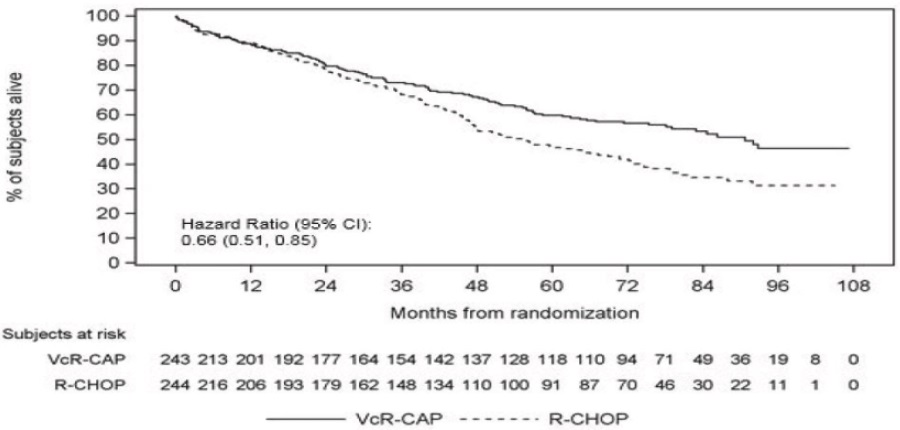 This text provides information on Hazard Ratio (95% Cl) for two different treatments, VCR-CAP and R-CHOP, over various time points from randomization (in months). The hazard ratio for VCR-CAP is 0.66 with a confidence interval of 0.51 to 0.85. The number of patients receiving each treatment is also listed for each time point. Unfortunately, there is missing information for the VCR-CAP treatment at some time points.*
