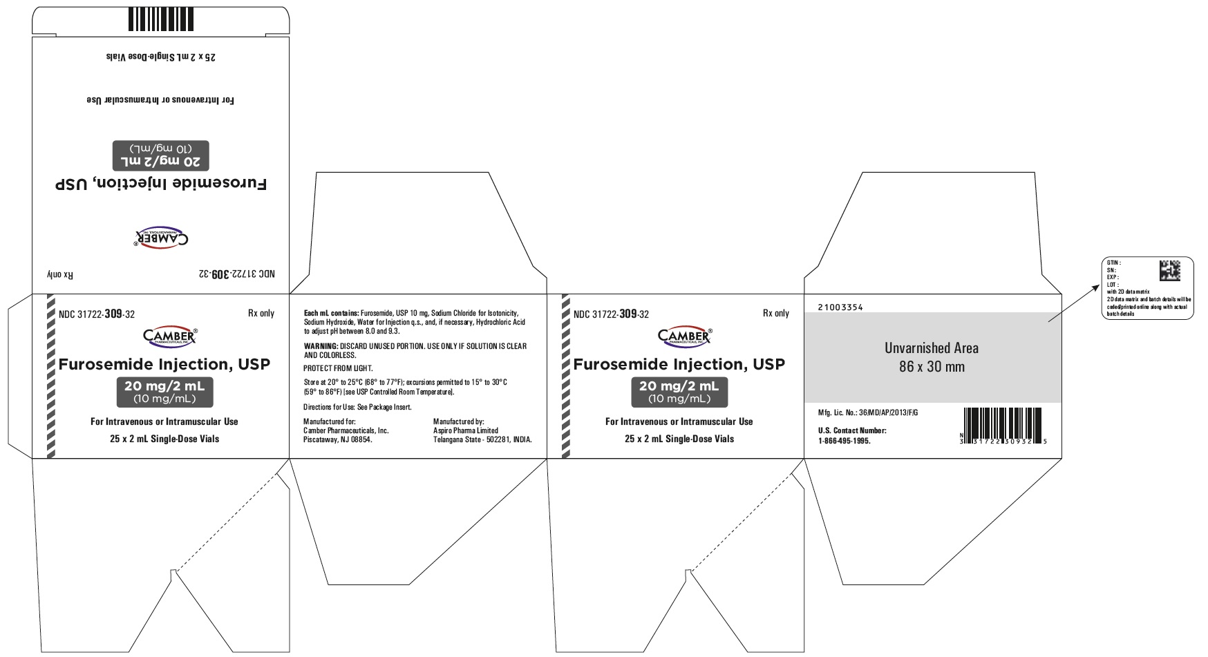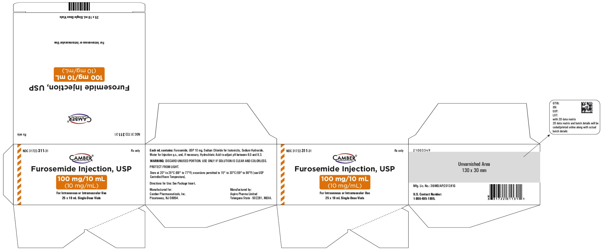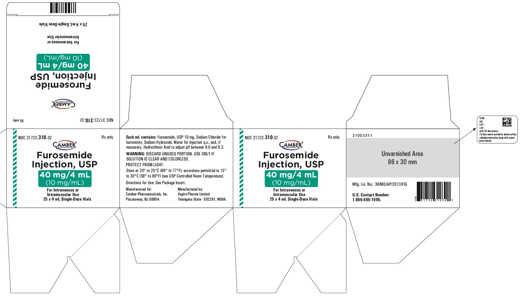 This is a description of Furosemide Injection in a 40 mg/4mL single-dose vial for Intravenous or Intramuscular use. The product is manufactured for Camber Pharmaceuticals, Inc. in Piscataway, NJ, and by Aspiro Pharma Limited in Telangana, India. The National Drug Code (NDC) is 31722-310.31 and it is part of a batch with Lot number and expiration date listed. For further details, refer to the package insert or contact the provided U.S. number for assistance.*