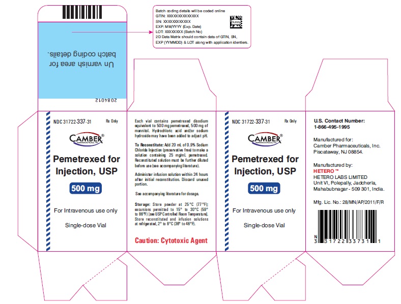 The following 15 images provide visual information about the product associated with Pemetrexed NDC 31722-337 by Camber Pharmaceuticals, Inc., such as packaging, labeling, and the appearance of the drug itself. This resource could be helpful for medical professionals, pharmacists, and patients seeking to verify medication information and ensure they have the correct product.