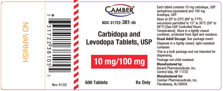 The following 10 images provide visual information about the product associated with Carbidopa And Levodopa NDC 31722-381 by Camber Pharmaceuticals, Inc., such as packaging, labeling, and the appearance of the drug itself. This resource could be helpful for medical professionals, pharmacists, and patients seeking to verify medication information and ensure they have the correct product.
