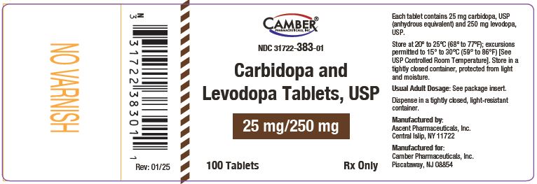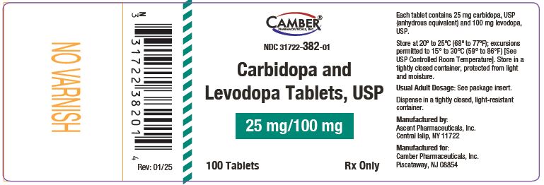This is a description of Carbidopa and Levodopa Tablets, USP 25 mg/100 mg bulk package, containing 1000 tablets for prescription use only. Each tablet consists of 25 g Carbidopa, USP and 100 mg Levodopa, USP. The tablets should be stored at a temperature of 20° to 25°C. The manufacturer is Ascent Pharmaceuticals, Inc., Central Islip, NY, and they are manufactured for Camber Pharmaceuticals, Inc., Piscataway, NJ.*