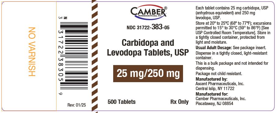 This is a description of Carbidopa and Levodopa Tablets, USP in 25 mg/250 mg strength, containing 500 tablets for prescription use only. Each tablet consists of 25 mg of carbidopa, USP, and 250 mg of levodopa, USP. It is advised to store the tablets between 20°C to 25°C (68°F to 77°F) with permissible excursions to 15°C to 30°C (59°F to 86°F). The medication should be kept in a tightly closed container, protected from light and moisture. This bulk package is not meant for direct dispensing and is not child resistant. Manufactured by Ascent Pharmaceuticals, Inc., Central Islip, NY 11722, for Camber Pharmaceuticals, Inc., Piscataway, NJ 08854. Refer to the package insert for the usual adult dosage information.*
