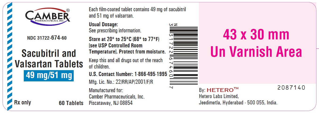 This text provides information on a medication with NDC 31722-673-60, containing 24 mg of sacubitril and 26 mg of valsartan in each tablet. It is for prescription use only and comes in a bottle of 60 tablets. The usual dosage should be followed as per prescribing information. The tablets should be stored at 20-25°C, protected from moisture, and kept out of reach of children. The manufacturer is Camber Pharmaceuticals, Inc., with contact information provided. The medication is manufactured by Hetero Labs Limited in Hyderabad, India.*