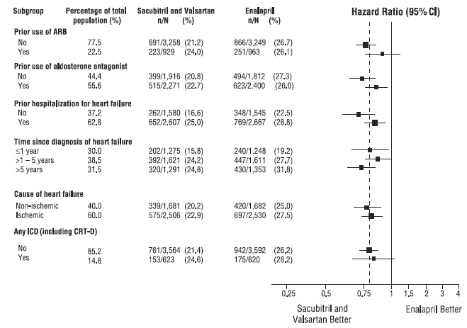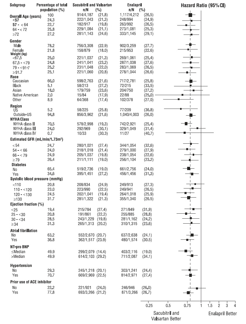 The text provides a detailed breakdown of the subgroup percentages within a study comparing Sacubitril and Valsartan against Enalapril. It shows various demographics, including age groups, gender distribution, weight categories, racial backgrounds, regions, NYHA class, estimated GFR levels, presence of diabetes, systolic blood pressure ranges, ejection fraction percentages, presence of atrial fibrillation, NT-pro BNP levels, hypertension status, and prior use of ACE inhibitors. The hazard ratio analysis is presented for each subgroup, offering valuable insights into the effectiveness and outcome differences among the different subgroups.*