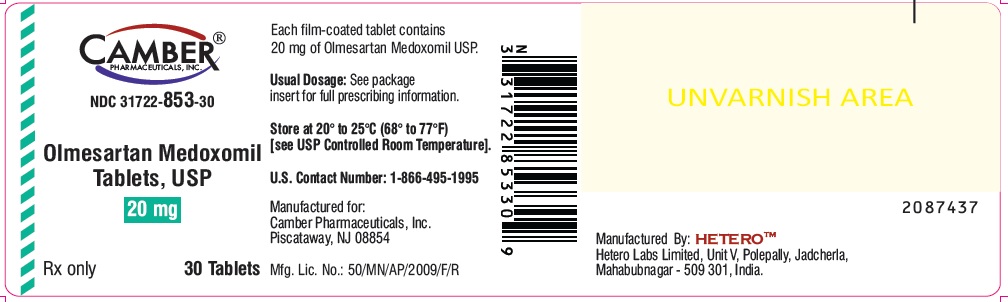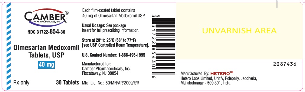The following 6 images provide visual information about the product associated with Olmesartan Medoxomil NDC 31722-854 by Camber Pharmaceuticals, Inc., such as packaging, labeling, and the appearance of the drug itself. This resource could be helpful for medical professionals, pharmacists, and patients seeking to verify medication information and ensure they have the correct product.