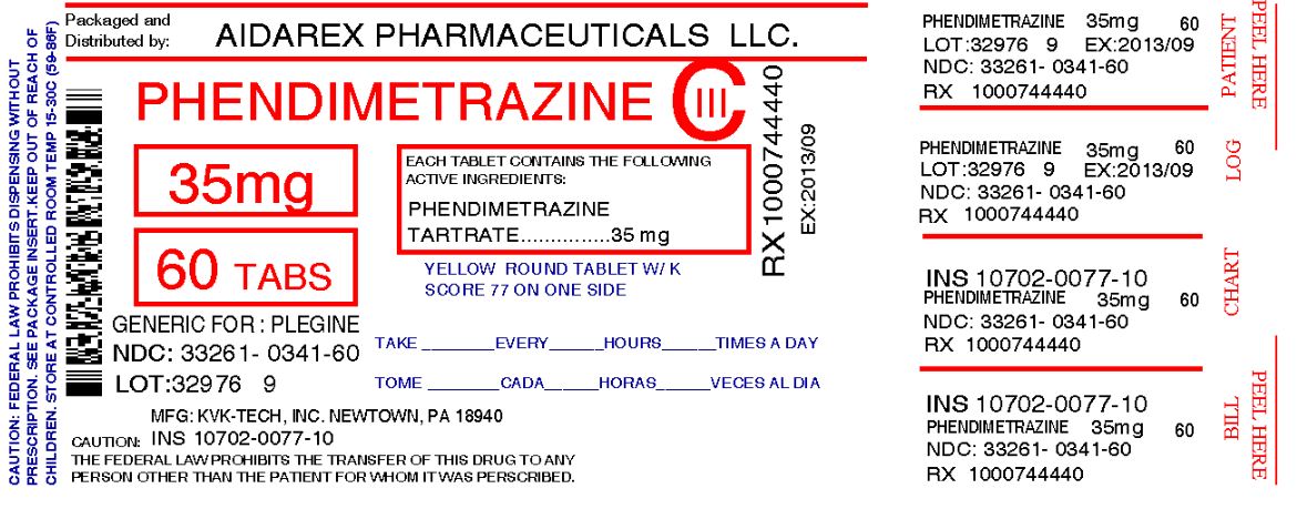 The following 3 images provide visual information about the product associated with Phendimetrazine Tartrate NDC 33261-341 by Aidarex Pharmaceuticals Llc, such as packaging, labeling, and the appearance of the drug itself. This resource could be helpful for medical professionals, pharmacists, and patients seeking to verify medication information and ensure they have the correct product.