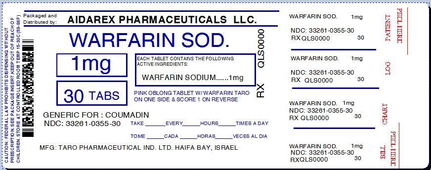 This is a prescription drug called Warfarin Sodium 1mg which comes in the form of pink oblong tablets. A package insert is provided with the prescription, and this drug should be kept out of the reach of children. The drug is manufactured by Taro Pharmaceutical Industries Ltd in Haifa Bay, Israel for Aidarex Pharmaceuticals LLC. The package contains 30 tablets with the National Drug Code 33261-0355-30. The drug should be taken every few hours for which the specific instructions are not readable. Two other National Drug Codes, 33261.0365.20 and 33567.0355.50, are also mentioned in the text, but their purpose is not clear.*