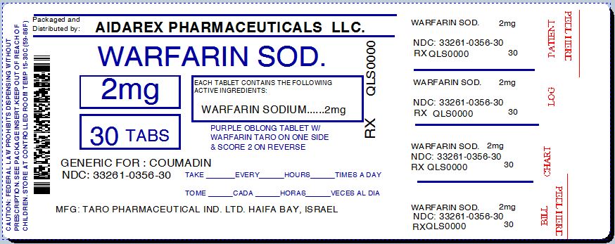This text contains information on a medication called Warfarin Sodium, with a strength of 2mg. The medication is available in tablet form and is produced by Aidarex Pharmaceuticals LLC and Taro Pharmaceutical industries. The National Drug Code (NDC) for this medication is 33261-0356-30. It is a generic version of Coumadin, used to prevent blood clots, and the recommended dose and frequency of the medication are not mentioned in the available text.*