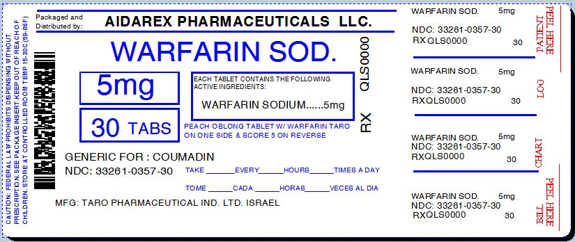 This is the description for the medication Warfarin Sod. 5mg, manufactured by Taro Pharmaceuticals. This bottle contains 30 tablets of Warfarin Sod. Each tablet consists of Warfarin Sodium 5mg. The medication's National Drug Code (NDC) is 33261-0357-30. This medicine is a generic version of Coumadin, NDC: 33261-0357-30. The tablet has an imprint that reads WARFARRSAD! B and GCORE 5. The recommended dosage is to take every few hours, at 15:300 (s2-56F), as directed by a doctor. Please keep this medication in a controlled room temperature for safety purposes.*