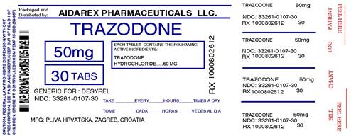 This is a bottle label for a generic antidepressant drug named Trazodone manufactured by AIDAREX PHARMACEUTICALS LLC. The drug comes in the form of tablets with a strength of 50mg, and the bottle contains 30 tablets. The drug is used to treat depression and anxiety. The label also contains a lot number, expiration date and manufacturer's information.*