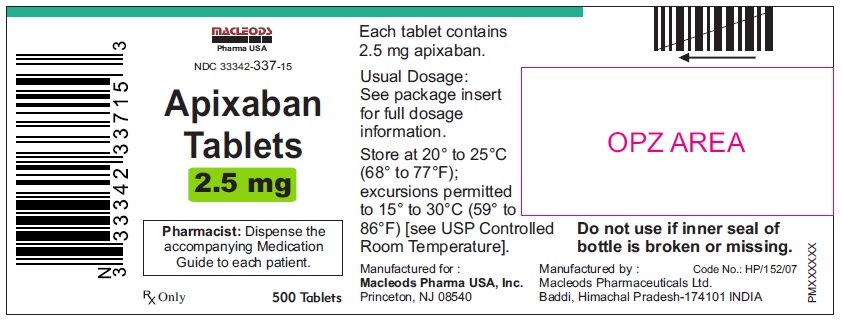 This is a description for Apixaban Tablets, identified with National Drug Code 33342-337-12. The text also indicates the necessity for pharmacists to provide a Medication Guide to each patient. The tablets are 2.5 mg and come in a unit-dose package. The packaging should contain essential dosage information for patient use. Additionally, caution is advised as the unit-dose package may not be child-resistant.*