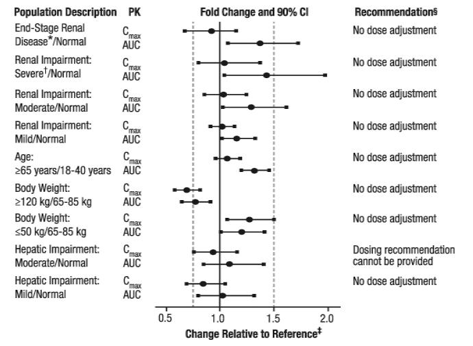 This text outlines population descriptions based on various health conditions such as end-stage renal disease, renal impairment, age ranges, body weight categories, and hepatic impairment levels. It also provides information on fold change and 90% confidence intervals, along with dosing recommendations. Specific recommendations for dose adjustments are indicated for different conditions, with a note that dosing recommendations cannot be provided in some cases.*
