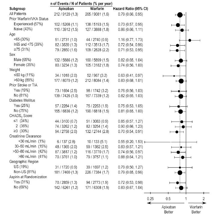 This text provides information on the subgroups of patients included in a study for evaluating the outcomes of Apixaban versus Warfarin in terms of various parameters such as age, sex, weight, prior stroke or TIA history, diabetes status, CHADS score, creatinine clearance, geographic region, and more. It also presents the number of events per year for each medication and the hazard ratios with their corresponding confidence intervals. The text indicates that Apixaban was generally more effective compared to Warfarin based on the results provided. This detailed data can be used by healthcare professionals and researchers to understand the effectiveness and safety of these medications in different patient subgroups.*