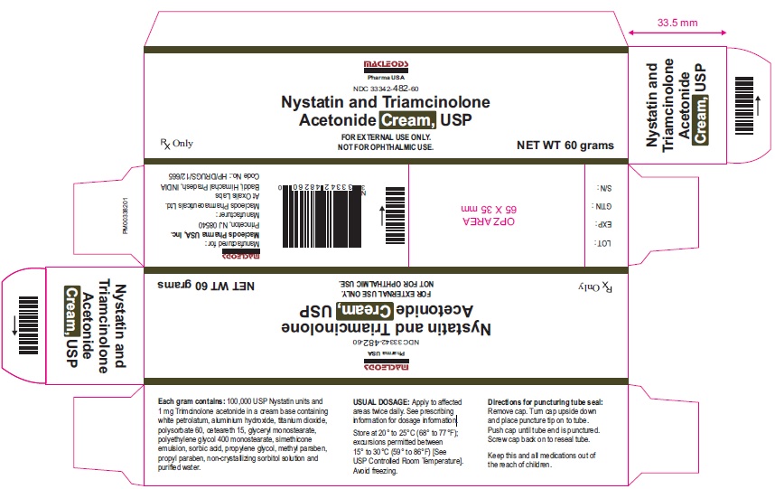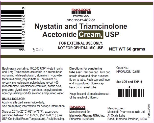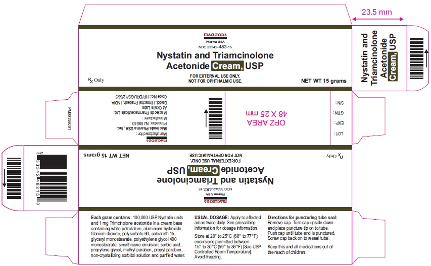 NDC 33342-482-15 is a cream containing Nystatin and Triamcinolone Acetonide [fET) USP, and it's for external use only. The cream contains 100,000 USP Nystatin units and 1 mg Trimcinolone acetonide per gram. The usual dosage is to apply it to affected areas twice daily, but users should check the prescribing information for dosage information. The cream should be stored between 20° to 25°C (68° to 77°F) and should be kept out of the reach of children. The manufacturer is Macleods Pharmaceuticals Ltd, and the cream is made at the Baddi, Himachal Pradesh, INDIA location.*