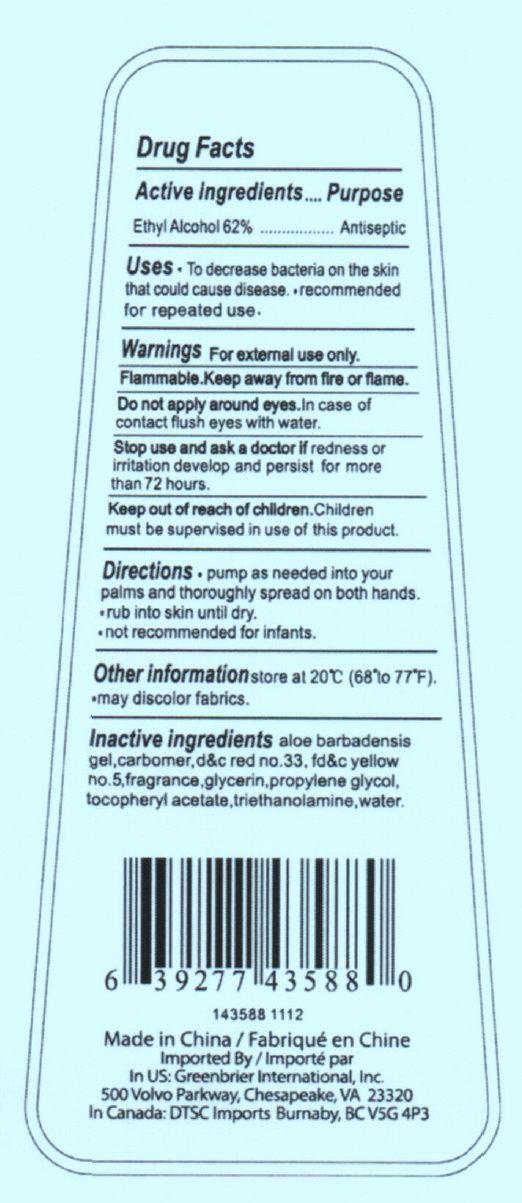 This is a drug facts label for a hand sanitizer containing 62% Ethyl Alcohol, which is an antiseptic. It is used to decrease bacteria on the skin, but not recommended for infants. It is cautioned to stop using and ask a doctor in case of irritation or redness for more than 72 hours. The inactive ingredients include aloe vera, glycerin, and fragrance. It is made in China and imported by Greenbrier International, Inc. in the US and DTSC Imports in Canada. The product should be stored at room temperature, and it may discolor fabrics. Children should be supervised during use.*