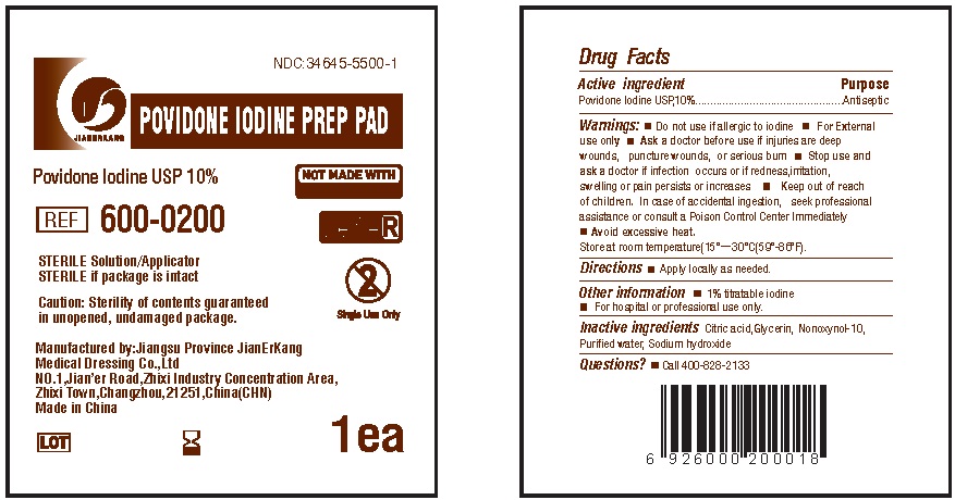 The following image provide visual information about the product associated with Povidone Iodine Prep Pad NDC 34645-5500 by Jianerkang Medical Co., Ltd, such as packaging, labeling, and the appearance of the drug itself. This resource could be helpful for medical professionals, pharmacists, and patients seeking to verify medication information and ensure they have the correct product.