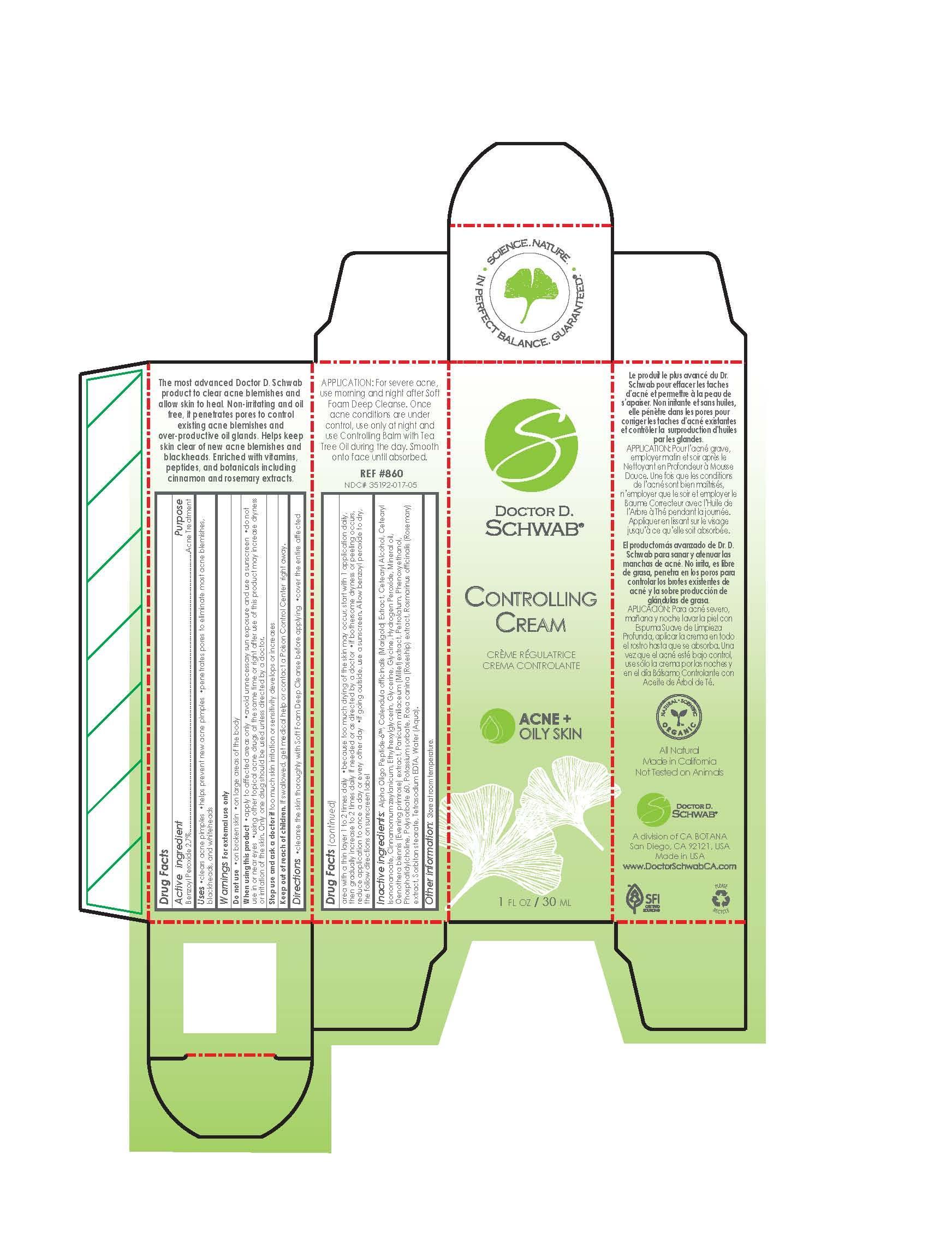 This is a product description for Doctor D. Schwab's controlling cream, which claims to help with acne blemishes and overactive oil glands. It contains Benzoyl Peroxide (2.7%) and botanicals such as cinnamon and rosemary extracts, vitamins, and peptides. The product is non-irritating and oil-free. The packaging includes directions for use, warnings, and drug facts. The cream is recommended for use morning and night and application after Soft Foam Deep Cleanse. After the acne condition is under control, using only one or cream for additional nourishment is recommended. The product is inactive on broken skin and large areas of the body.*