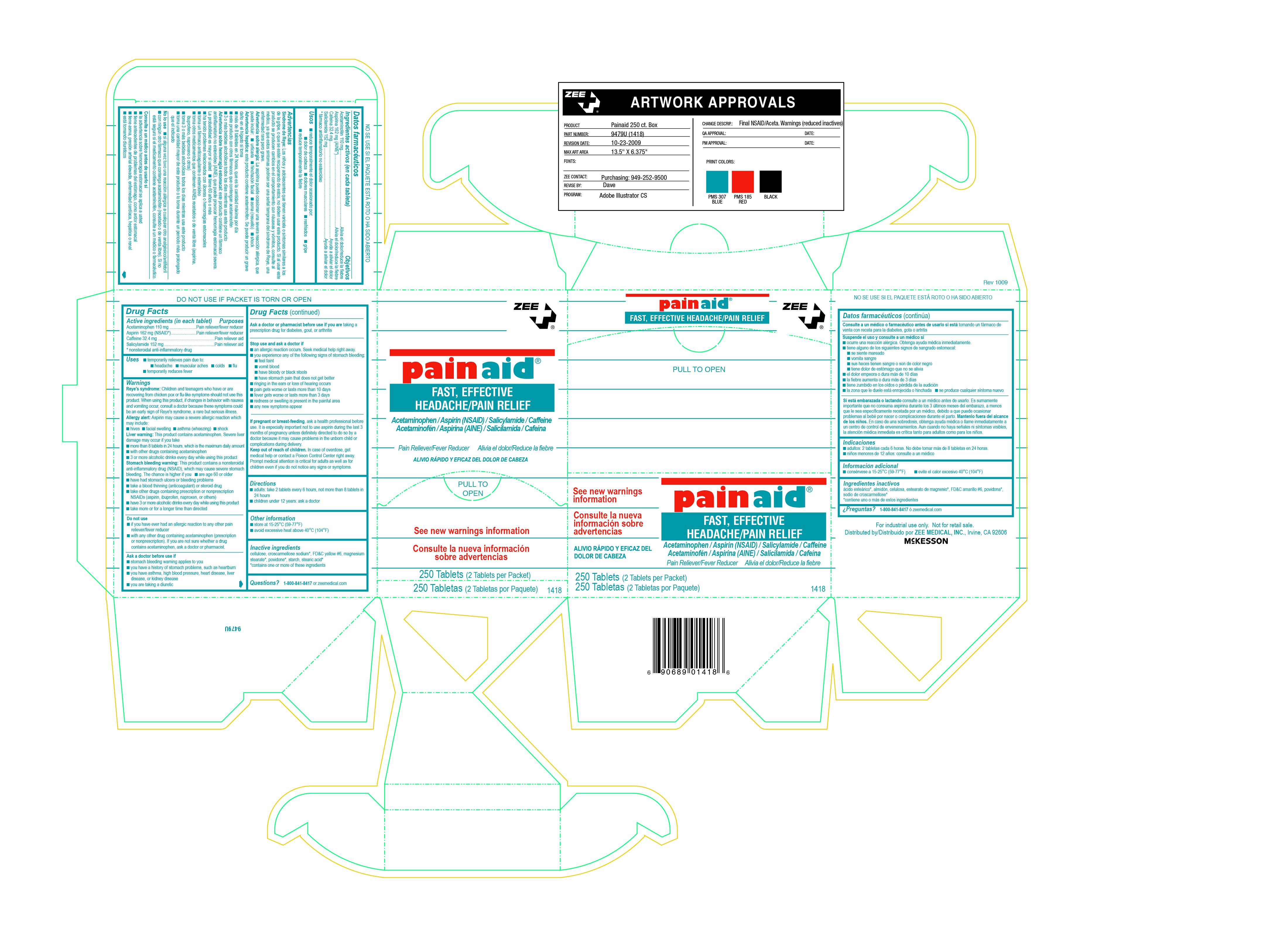 This appears to be a scanned image of a medication box that contains pain relieving tablets with active ingredients such as acetaminophen and aspirin as well as caffeine and salicylamide. The text provides information on its usage directions for adults and children, its active ingredients, its warnings to seek medical attention in case of side effects or allergic reactions, and the importance of seeking medical advice from a doctor or pharmacist if already using other prescription or non-prescription medication.*