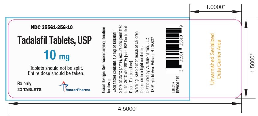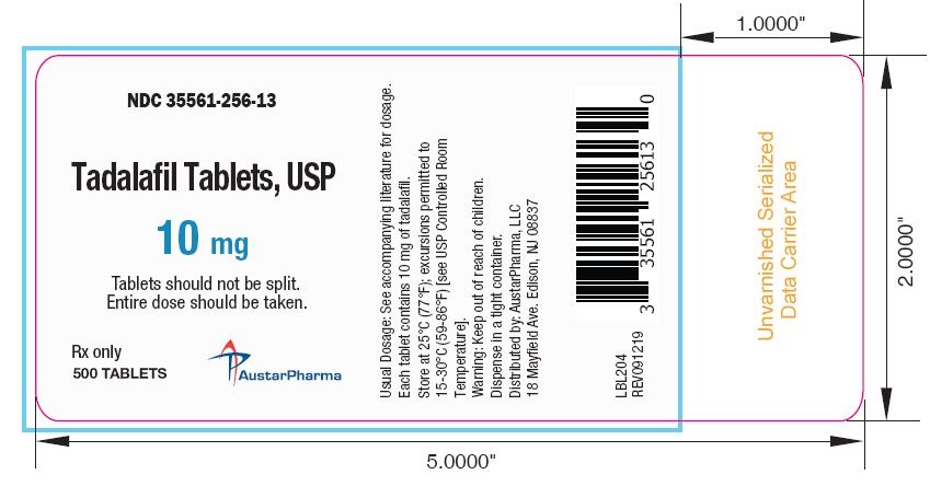 This text is a pharmaceutical label for Tadalafil Tablets, with a concentration of 10 mg per tablet. It is indicated that the tablets should not be split, and the entire dose should be taken. The label includes product information such as the manufacturer (AustarPharma) and the quantity of tablets provided (500 tablets). The text also contains a National Drug Code (NDC) for the product.*