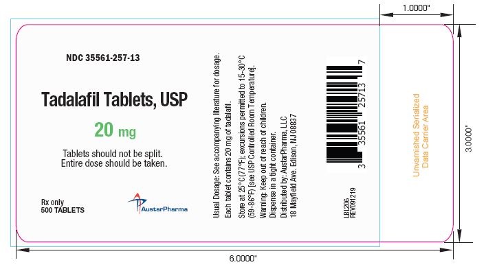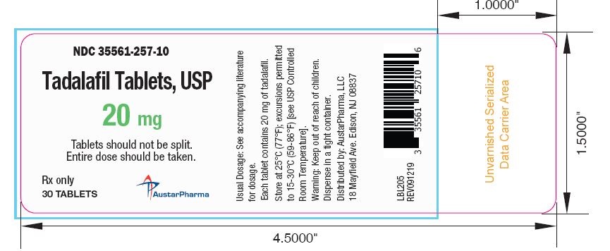 This text includes details about Tadalafil Tablets, USP with a dosage indication that the tablets should not be split and the entire dose should be taken. It also mentions that the product comes in a pack of 30 tablets and provides the National Drug Code (NDC) 35561-257-10. This information is intended for prescription use only.*