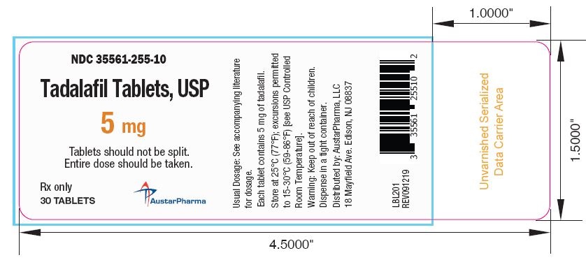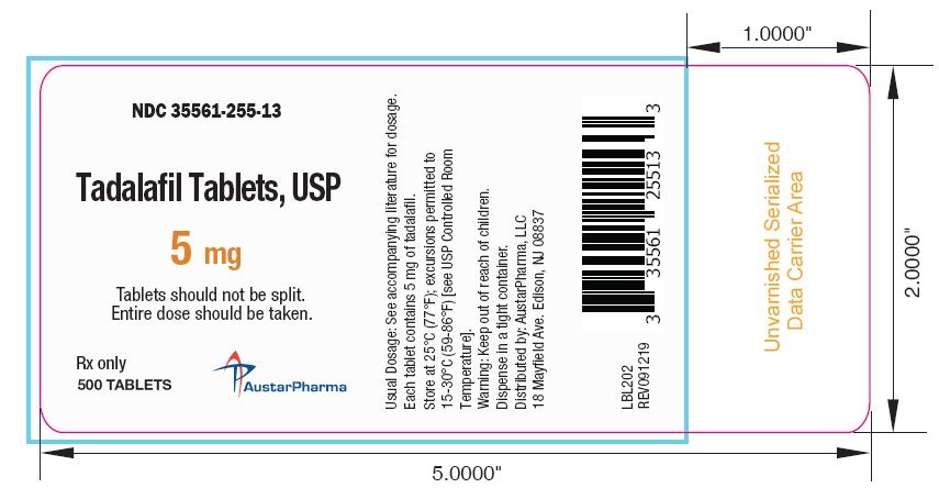 This text appears to be a label or description for Tadalafil tablets with a prescription use. It specifies that the tablets should not be split and the entire dose should be taken. The information also includes a National Drug Code (NDC) as 35561-255-13 and mentions the quantity as 500 tablets.*