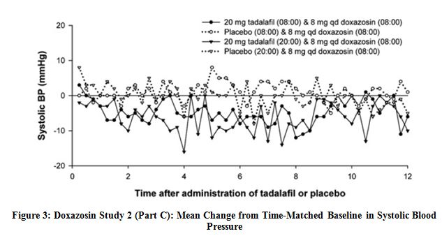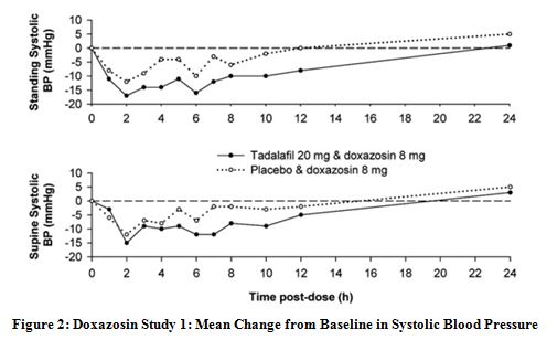 This is a medical evaluation of a study comparing the effect of Tadalafil 20 mg & Doxazosin 8 mg versus Placebo & Doxazosin 8 mg on systolic blood pressure. The study evaluates the mean change from baseline in systolic blood pressure over time post-dose. The results are displayed graphically in Figure 2.*