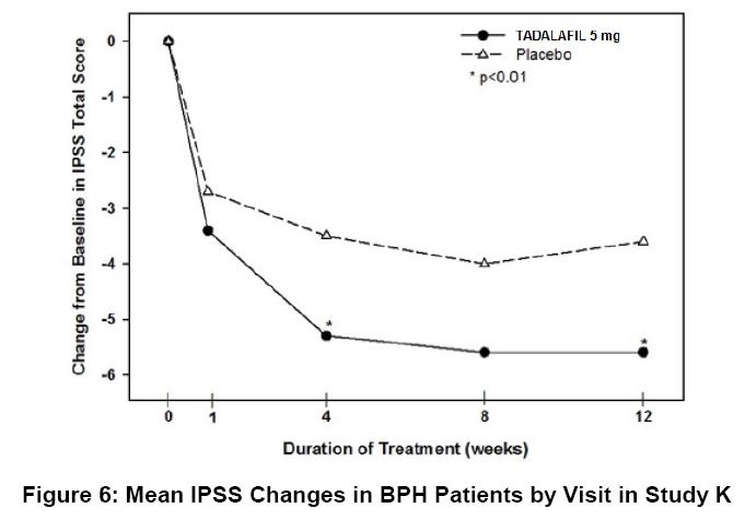 This text provides information on the comparison of Tadalafil 5 mg and Placebo in BPH patients over weeks of treatment. The figure shows the Mean IPSS Changes by visit in Study K, illustrating the effectiveness of Tadalafil in managing symptoms related to BPH.*
