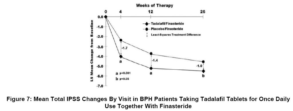 This text provides information about a study comparing Tadalafil 5mg with Placebo in BPH (Benign Prostatic Hyperplasia) patients over a duration of 12 weeks. It shows mean IPSS (International Prostate Symptom Score) changes at different visits. Tadalafil is a medication used to treat erectile dysfunction and symptoms of enlarged prostate. The figure displayed likely presents the effectiveness of Tadalafil in improving symptoms in BPH patients compared to a placebo.*