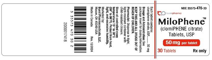 The following 2 images provide visual information about the product associated with Milophene NDC 35573-470 by Burel Pharmaceuticals, Llc, such as packaging, labeling, and the appearance of the drug itself. This resource could be helpful for medical professionals, pharmacists, and patients seeking to verify medication information and ensure they have the correct product.