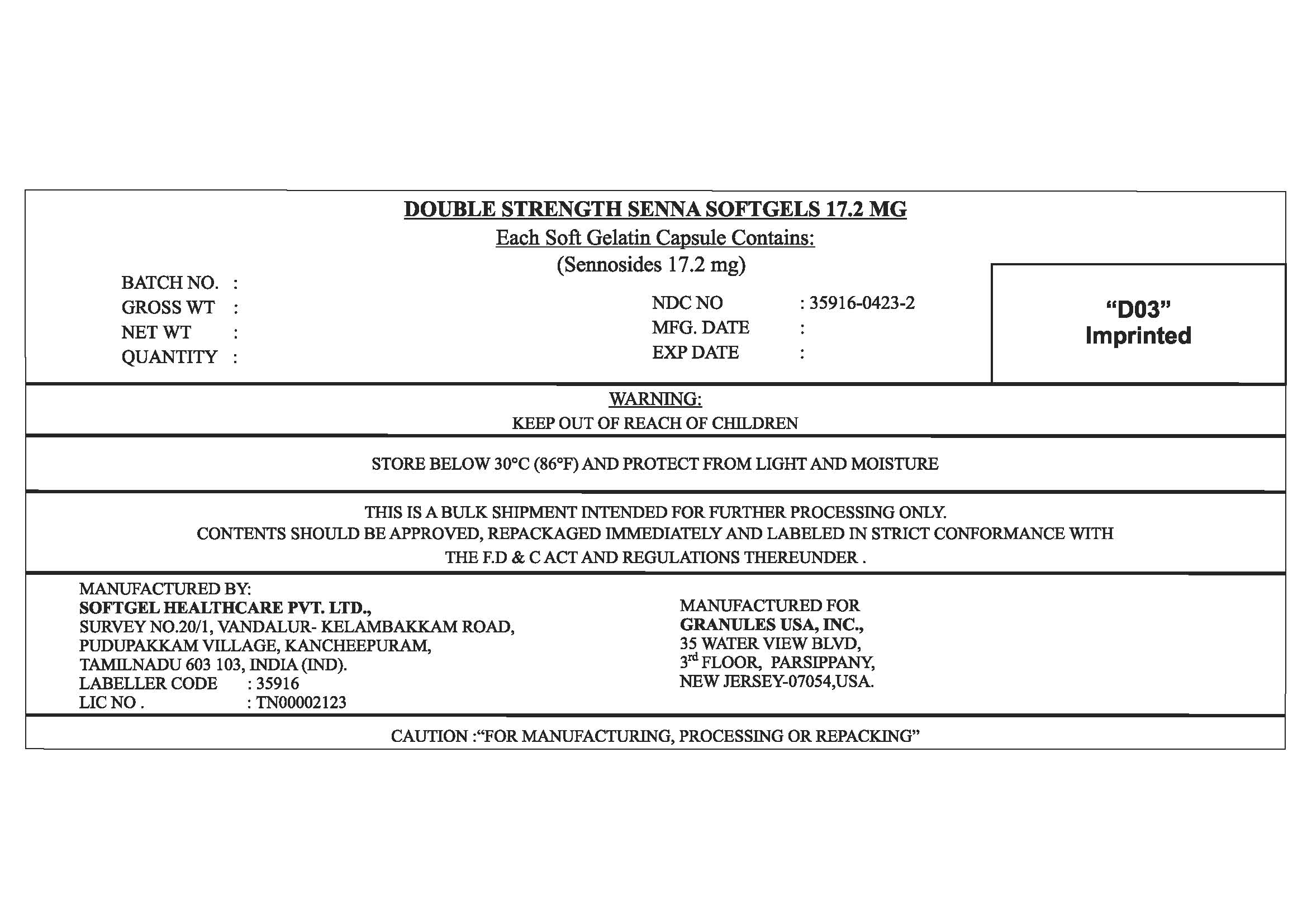 Double Strength Senna Softgels are a type of medication contained in a soft gelatin capsule that includes 17.2 mg of sennosides. The medication is meant to be repackaged before being sold to consumers. The packaging includes a warning to keep the medicine out of reach of children and instructions to store it below 30°C and protect it from light and moisture. The manufacturer is Softgel Healthcare Pvt. Ltd. and the product was manufactured for Granules USA, Inc. The caution advises that the product is intended for manufacturing, processing or repacking only.*
