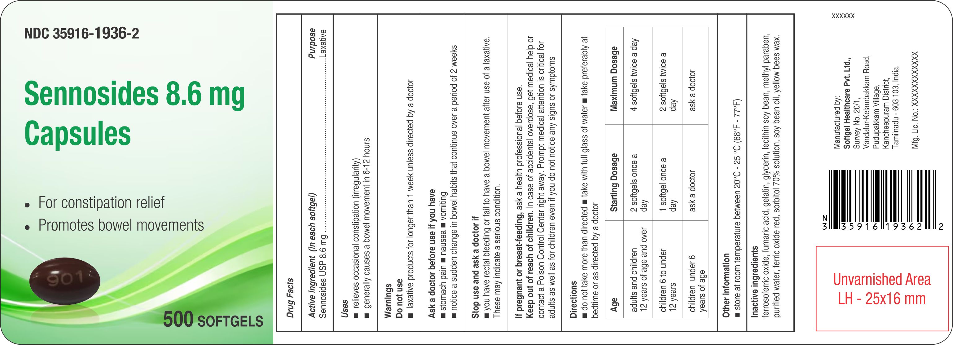 The following image provide visual information about the product associated with Sennosides NDC 35916-1936 by Softgel Healthcare Pvt Ltd, such as packaging, labeling, and the appearance of the drug itself. This resource could be helpful for medical professionals, pharmacists, and patients seeking to verify medication information and ensure they have the correct product.