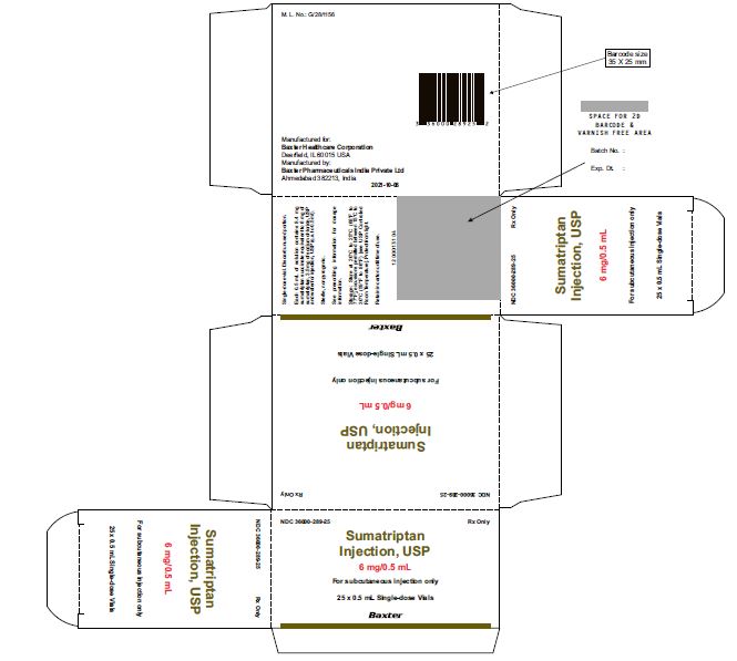 This is a description of a medication with NDC code 36000-289-01 indicated for subcutaneous injection only. Each vial contains 0.5 mL of solution which has 8.4 mg of sumatriptan succinate equivalent to 6 mg of sumatriptan and 3.5 mg of sodium chloride. The solution is for injection and is made in India by LM. The medication is a single-dose vial manufactured for Baxter Healthcare Corporation with an expiration date of 2021-10-06.*