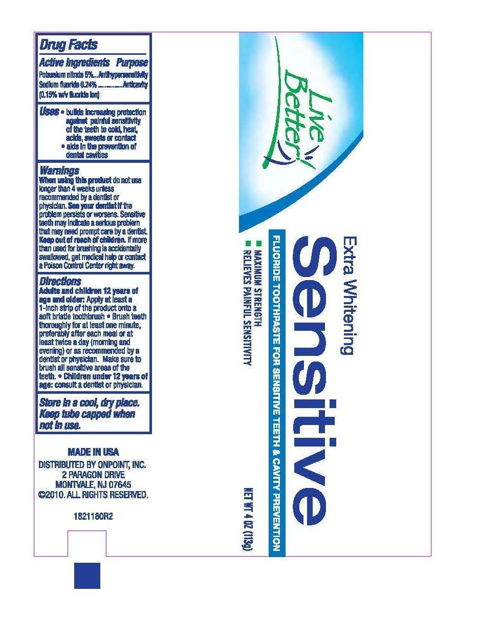 This is the description of a toothpaste named Extra Whitening Sensitive that helps relieve painful tooth sensitivity and prevent cavities. It contains fluoride and potassium nitrate to help with sensitivity caused by heat, cold, acid, sweets, or contact. The toothpaste should be applied to a soft-bristled toothbrush, and teeth should be brushed thoroughly for at least one minute after each meal or before going to bed. The toothpaste is made in the USA and distributed by the ON P0 INT, Inc. The drug facts label provides directions for use, safety warnings, and information about the inactive ingredients included in the toothpaste.*