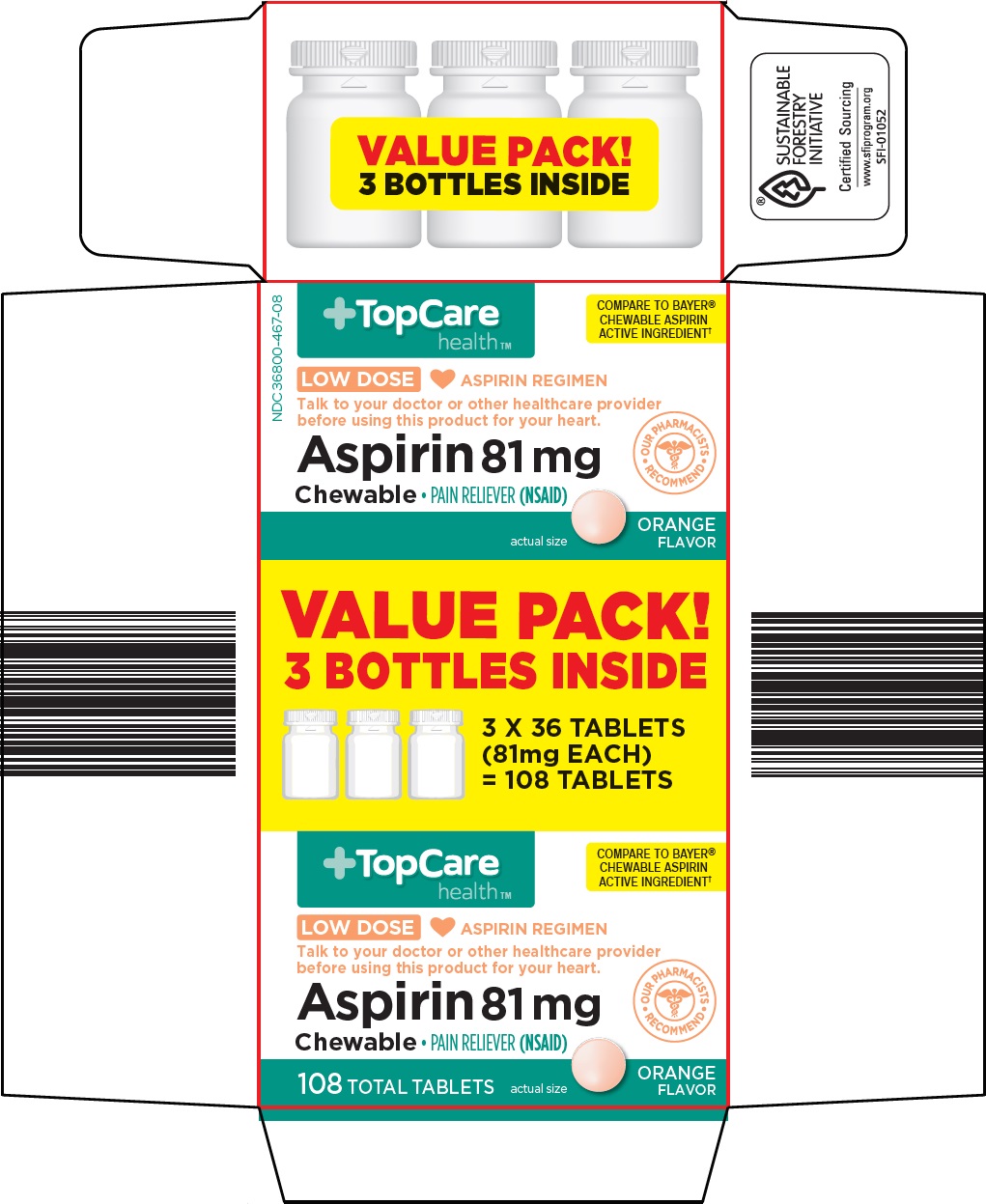 The following 2 images provide visual information about the product associated with Topcare Aspirin NDC 36800-467 by Topco Associates Llc, such as packaging, labeling, and the appearance of the drug itself. This resource could be helpful for medical professionals, pharmacists, and patients seeking to verify medication information and ensure they have the correct product.
