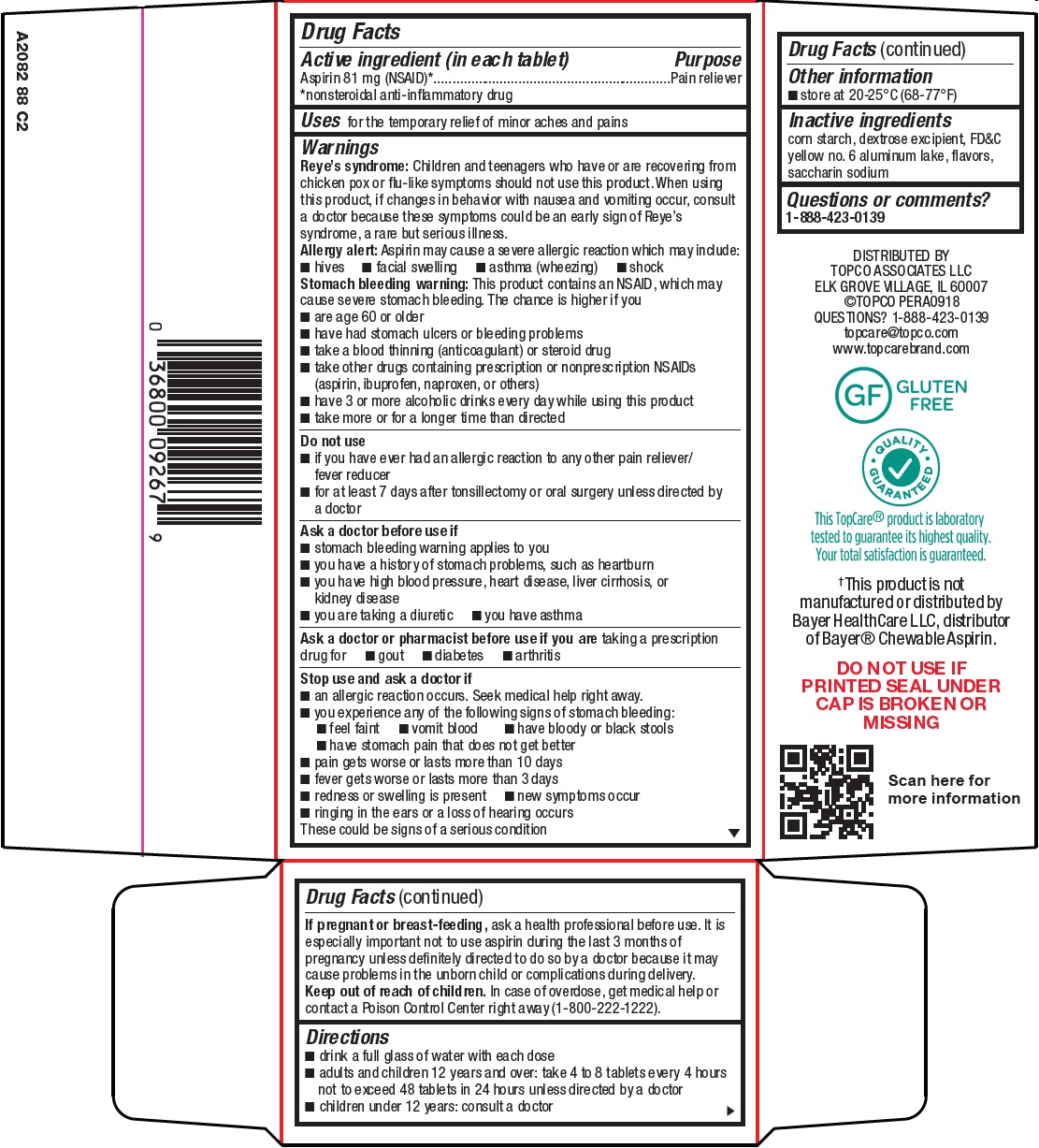 This is a drug facts label for aspirin tablets, each containing 81mg of aspirin, a non-steroidal anti-inflammatory drug (NSAID). The tablets can be used for temporary relief of minor aches and pains. The warnings section includes information on Reye's syndrome, stomach bleeding, and allergic reactions to aspirin. Persons with certain health conditions or taking other prescriptions should consult their doctor before use. The directions and other information are also provided. The product is distributed by Topco Associates LLC and is gluten-free.*