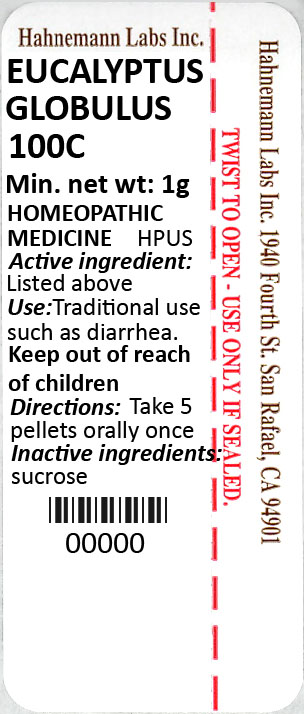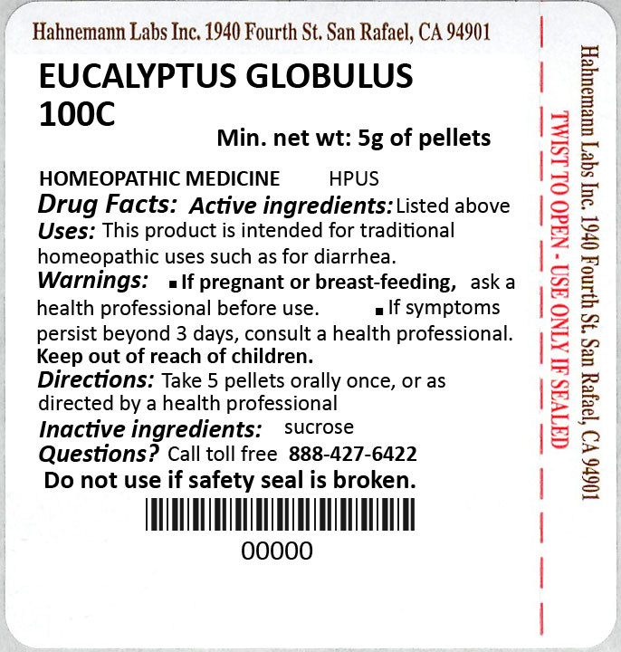 Hahnemann Labs Inc. in San Rafael, CA, sells Eucalyptus Globulus 100C, a homeopathic medicine for diarrhea containing 30g of pellets, with sucrose as an inactive ingredient. The drug facts list active ingredients but do not give their quantities. The product label warns pregnant and breastfeeding women to check with a health professional before use and informs users to discontinue use if symptoms persist past three days, and the pellets should be kept away from children. The recommended dosage is 5 pellets, to be taken orally once, or as directed by a health professional. For questions or concerns, call 888-427-6422. The last line appears to be unrelated or unintelligible.*