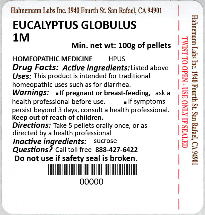 Hahnemann Labs Inc is a homeopathic medicine company located in San Rafael, California. This particular product is Eucalyptus Globulus 1M and comes in a minimum net weight of 100g pellets. It is intended for traditional homeopathic uses such as for diarrhea. The active ingredient is listed as well as the inactive ingredient, which is sucrose. There are warnings to consult with a health professional if pregnant or breast-feeding, symptoms persist beyond three days, or if children might have access. The directions are to take 5 pellets orally once, or as directed by a health professional. For any inquiries, call toll-free 888-427-6422. The scrambled letters at the end are not readable.*