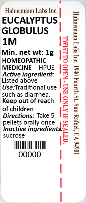 Hahnemann Labs Inc, 1940 Fourth St. San Rafael, CA 94901, produces a homeopathic medicine, Eucalyptus Globulus, in 500C potency with a net weight of 5g of pellets. It is intended for traditional homeopathic uses such as for diarrhea, meaning it is made from natural ingredients and diluted to be safe to use. The active ingredients are listed on the label, and the user is instructed to take 5 pellets orally once, or as directed by a health professional. If symptoms persist after 3 days, it is advised to consult a health professional. The medicine should be kept away from children and not be used by pregnant or breastfeeding women without consulting a doctor. Inactive ingredients include sucrose. Any inquiries may be directed to the toll-free number, 888-427-6422. Correctly reading the last paragraph is not possible; thus, it is not included in the description.*