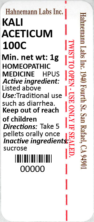 Hahnemann Labs Inc is a company located in San Rafael, CA, that produces Kali Aceticum 100C, a homeopathic medicine indicated for the treatment of diarrhea. The product contains 5g of pellets with sucrose as inactive ingredient. There are warnings on the label to not use during pregnancy or breastfeeding and to consult a health professional if the symptoms persist. The recommended dosage is 5 pellets orally once or as directed by a health professional. If the safety seal is broken, the product should not be used. For further information, the toll-free number is provided. The rest of the text includes characters that are not readable through .*