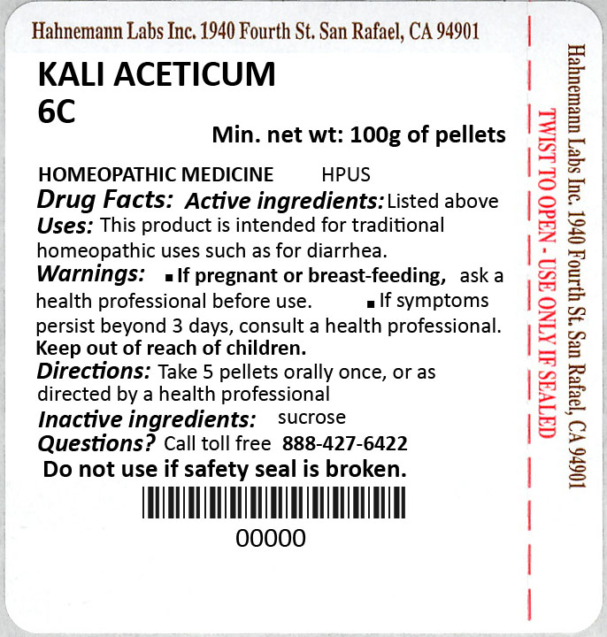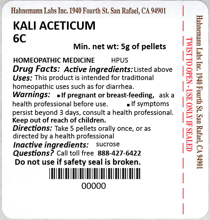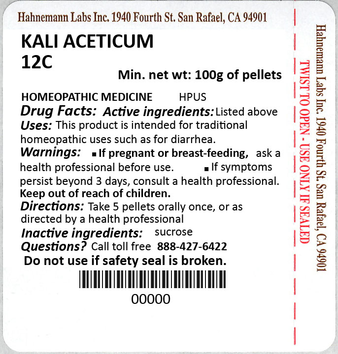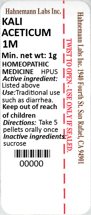 Hahnemann Labs Inc., located at 1940 Fourth St. in San Rafael, CA 94901, produces a homeopathic medicine called Kali Aceticum 1M in pellet form. It is intended for traditional homeopathic uses, such as for diarrhea. This product contains sucrose as an inactive ingredient, and its net weight is 5g. The user should take 5 pellets orally once or as directed by a health professional. It is important to consult a health professional if symptoms persist beyond three days, and pregnant or breastfeeding individuals should also consult a health professional before using this product. The manufacturer may be contacted with questions at 888-427-6422.*
