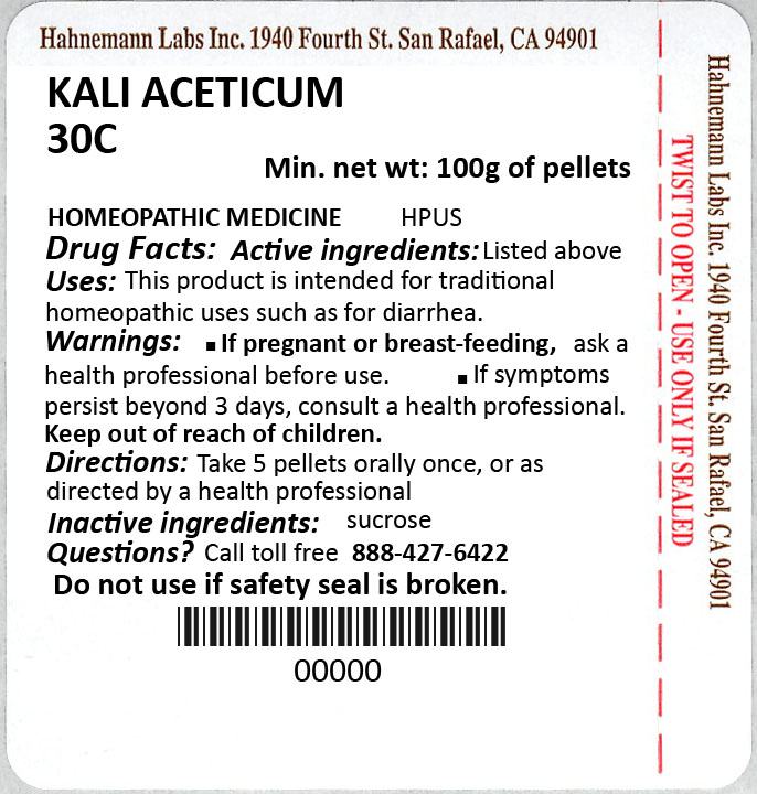 Hahnemann Labs Inc is a company based in San Rafael, California that sells homeopathic medicine. The product listed is Kali Aceticum 30C pellets. This medicine is intended for traditional homeopathic uses such as diarrhea. The drug facts state that the only active ingredient is Kali Aceticum. The product contains sucrose as its inactive ingredient. There is a caution to consult a health professional if the symptoms persist beyond three days. Also, if pregnant or breast-feeding, one must ask a health professional before using the medicine. The directions instruct taking five pellets orally once or as directed by a health professional. The net weight of the pellets is 100g. If needed, one can contact the company through a toll-free number provided. The string of characters at the end is not legible.*