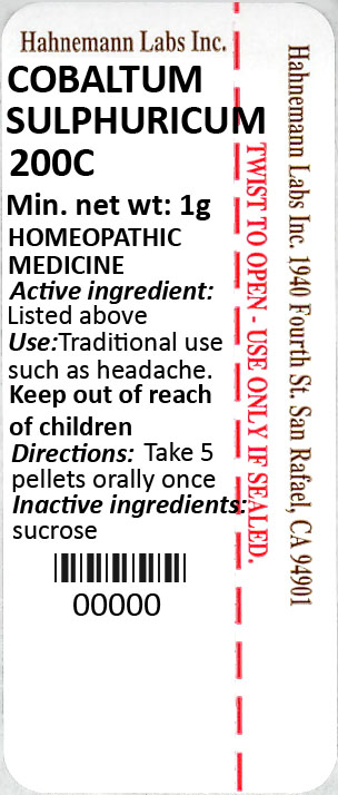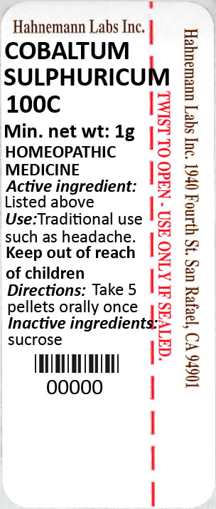 Hahnemann Labs Inc located in San Rafael, California sells a homeopathic medicine called COBALTUM SULPHURICUM 500C, which is intended for traditional use such as for headaches. The drug facts and directions are provided, and the product contains sucrose as an inactive ingredient. Consumers are instructed to call 888-427-6422 if they have any questions, and to not use if the safety seal is broken. The jumbled text at the end is not readable.*