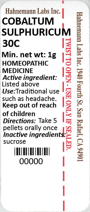 Hahnemann Labs Inc. offers a homeopathic medicine in the form of pellets containing Cobaltum sulphuricum in 30C potency for traditional use such as headache. The net weight of the product is 1g and it should be taken orally once with 5 pellets. The product should be kept out of reach of children and is primarily composed of sucrose.*