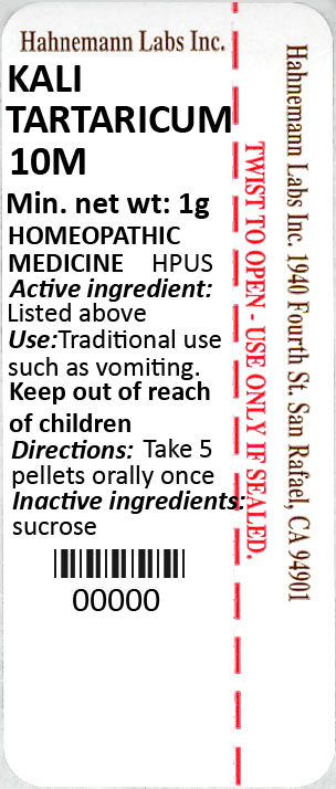 This is a label of a homeopathic medicine manufactured by Hahnemann Labs Inc. The medicine contains Kali Tartaricum as an active ingredient and is traditionally used for conditions such as vomiting. It is advised to keep it out of reach of children and take 5 pellets orally once. The net weight of the medicine is 1g and it contains sucrose as an inactive ingredient. There are also some illegible characters, probably due to bad quality.*